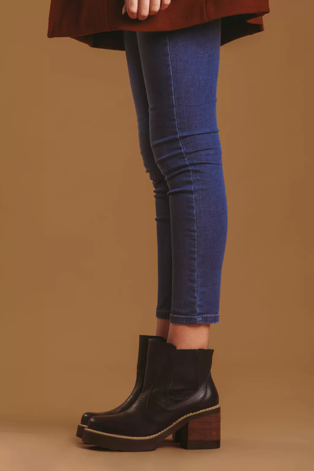 Este modelo de bota beatle con caña corta está confeccionada en cuero flouter con elástico, con base de TR (que es una goma termoplástica, un material fuerte, flexible, elástico, termo-moldeable y versátil) y su taco está revestido con folia; lo que otorga una suela de agradable pisada que acompaña el movimiento del pie. Además está forrada con forro vacuno, la inclinación del pie es de 3,5 cm. La altura del taco es de 7cm y la plataforma delantera es de 3cm.